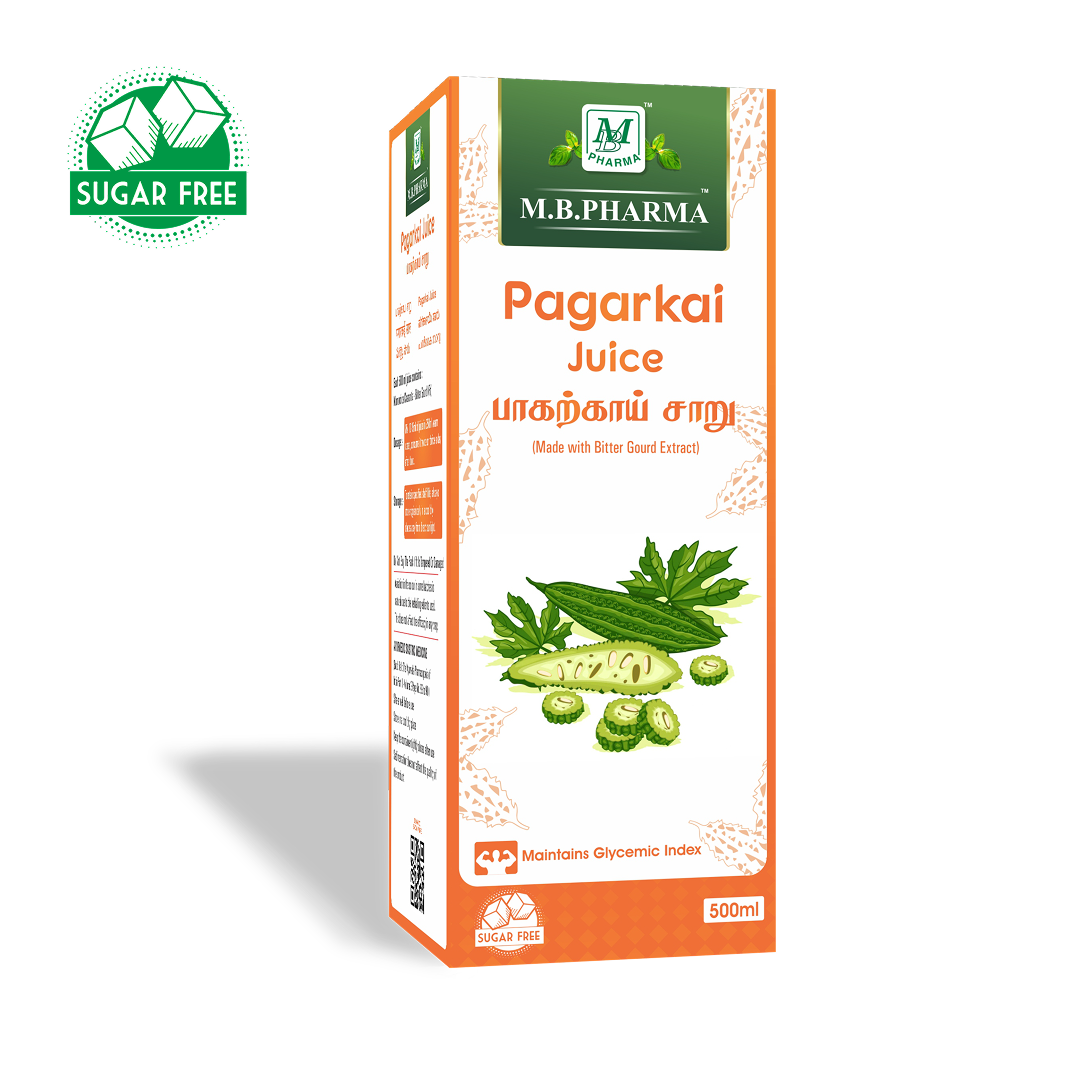 M.B. Pharma Pagarkai Juice is a sugar-free herbal drink made from pure bitter gourd extract.