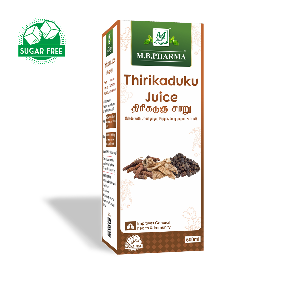 M.B. Pharma Thirikaduku Juice is a sugar-free herbal health drink made from dried ginger, pepper, and long pepper extracts.