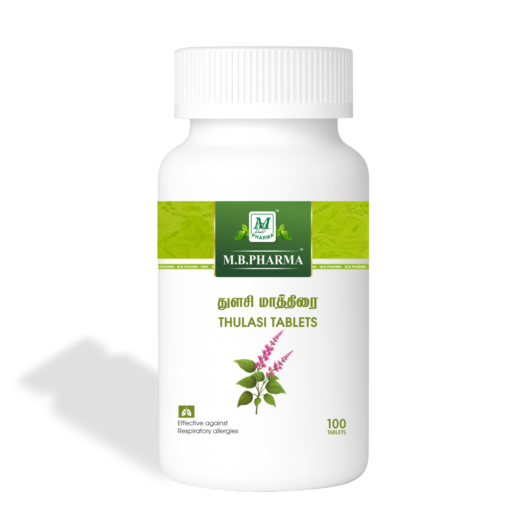 M.B. Pharma Thulasi Tablets – Herbal tablets made from the Holy Basil plant (Ocimum sanctum).